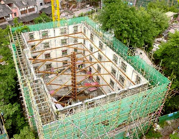 十八梯善果巷35號(hào),剛剛經(jīng)歷一場(chǎng)精密的“骨科手術(shù)”。建筑外墻被鋼架溫柔擁抱,內(nèi)部卻在進(jìn)行著脫胎換骨的改造。這不是普通的修繕,而是一次結(jié)構(gòu)體系的徹底革新。