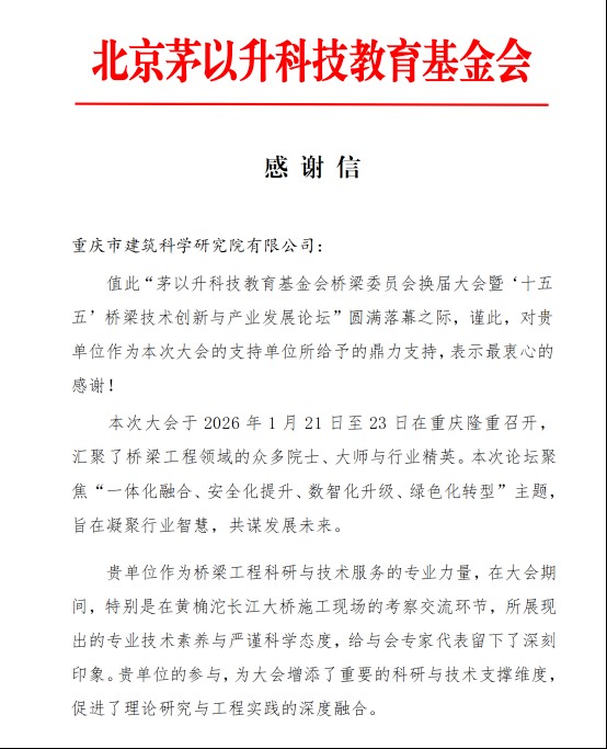 基金會在感謝信中表示,市建科院的監(jiān)理工作和專業(yè)展示,為本次論壇的成功舉辦提供了重要支撐,體現了新時代監(jiān)理單位在重大工程建設中的技術擔當與行業(yè)價值。這份認可,既是對市建科院團隊專業(yè)能力的認可,也是對重慶設計集團在橋梁工程領域持續(xù)貢獻的肯定。